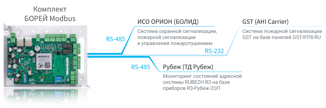 Комплект БОРЕЙ Mobdus предусмотрен для интеграции с «внешними» системами по протоколу Modbus. Контроллер БОРЕЙ комплектуется коммуникационным модулем МК-RS485М или МК-RS232 и плагином НЕЙРОСС Modbus RTU. Комплект позволяет осуществлять мониторинг состояний и управление элементами с использованием открытого промышленного протокола Modbus по интерфейсам RS-485 или RS-232 [Интеграция смежных систем по протоколу MODBUS].