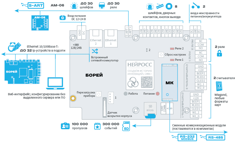 «Классический» контроллер БОРЕЙ на новой аппаратной архитектуре, обеспечивает подключение двух односторонних или одной двусторонней точки доступа. За счёт использования шины SART БОРЕЙ позволяет контролировать до 38 шлейфов сигнализации с контролем неисправности и до 32 реле. В комплекте БОРЕЙ Modbus за счёт коммуникационного модуля МК-RS485М обеспечивает возможность интеграции смежных систем по протоколу Modbus. В комплекте БОРЕЙ RS-485 Риэлта за счёт коммуникационного модуля МК-RS485Р обеспечивает возможность работы по протоколу «Риэлта-Контакт-АДР».