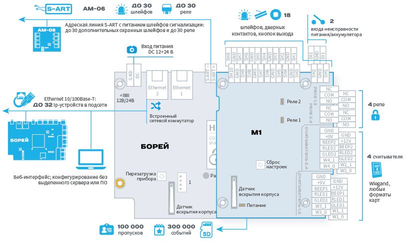 | БОРЕЙ 4 | Новый высокопроизводительный контроллер БОРЕЙ, дополнен расширителем М1, позволяющим удвоить количество точек доступа, реле и шлейфов сигнализации [Исполнение БОРЕЙ 4]. |