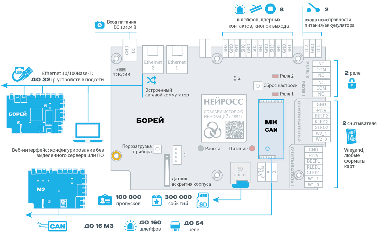 С помощью дополнительных модулей М3, подключаемых по интерфейсу CAN, благодаря высокой производительности самого контроллера и пропускной способности интерфейса, БОРЕЙ способен в режиме «мягкого» реального времени контролировать до 168 датчиков (извещателей, шлейфов), до 66 исполнительных устройств или до 34 точек доступа. Контроллеры БОРЕЙ могут быть объединены в одну сеть НЕЙРОСС для организации системы любого масштаба и сложности. Количество контроллеров в одной сети НЕЙРОСС не ограничено.