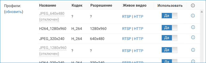 Перечень профилей используется при настройке задач на запись, а также при просмотре «живого» видео (по умолчанию выводится поток, наиболее подходящий к размеру окна видеонаблюдения. Также возможно переключение между профилями. Если профиль не должен отображаться при просмотре «живого» видео в видеоклиенте, его можно отключить с помощью переключателя в столбце Использовать.