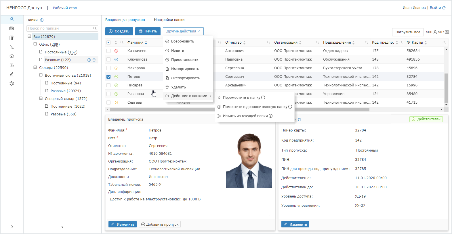 С версии 20.6 добавлена возможность создания нескольких пропусков у одного владельца. При этом они физически могли размещаться в разных папках, но если в конкретной папке есть хотя бы один пропуск владельца, то в ней отображались все пропуска этого владельца.