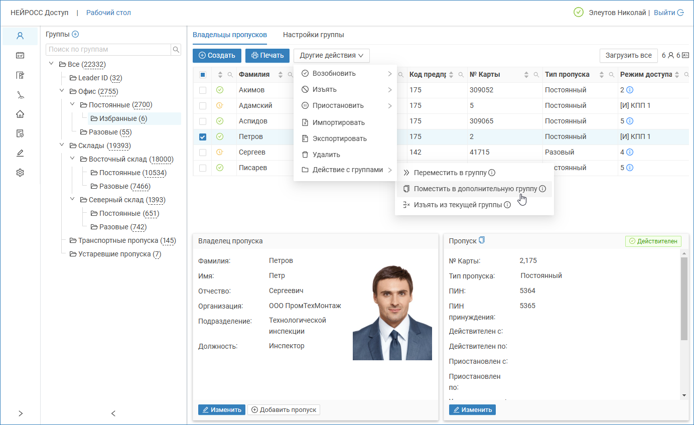 С версии 20.20 Платформы НЕЙРОСС в АРМ Доступ элемент Папка заменён на элемент Группа. Переименование выполнено для облегчения понимания механизма размещения одного и того же пропуска в разных группах одновременно.