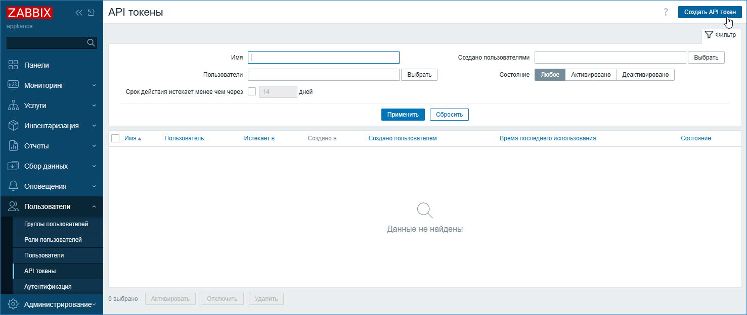 В разделе Пользователи > API токены нажмите на кнопку Создать API токен, расположенную в правом верхнем углу.