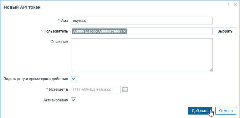В отобразившемся окне задайте произвольное имя токена, выберите требуемую учётную запись. При необходимости ограничения времени жизни задайте срок действия, либо снимите флаг в поле Задать дату и время срока действия. Оставьте флаг Активировано. Нажмите на кнопку Добавить.