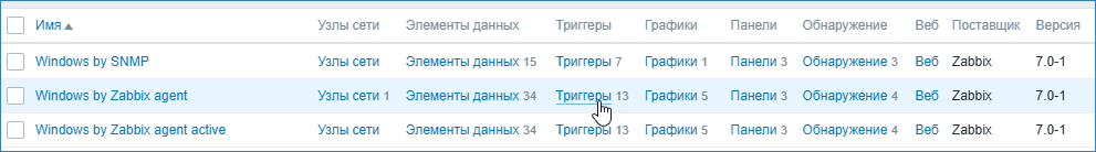 - Выберите Сбор данных (Configuration) > Шаблоны (Templates). Выберите требуемый шаблон, раскройте список триггеров (triggers).