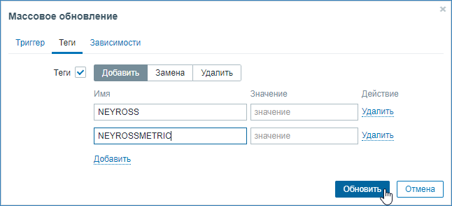 - Всем выбранным триггерам будут добавлены заданные метки (теги).