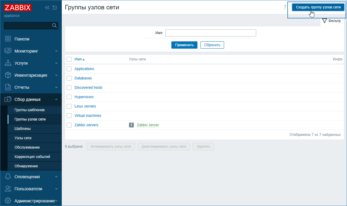 Выберите Сбор данных (Data Collection) > Группы узлов сети (Host groups). Нажмите на кнопку Создать группу узлов сети (Create host group).