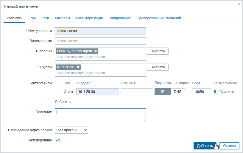 | Активировано (Enabled) | Оставьте флаг Активировано (Enabled), чтобы узел сети был активным, готовым к мониторингу. Если не отмечено, узел сети неактивен, его состояния не отслеживаются. |