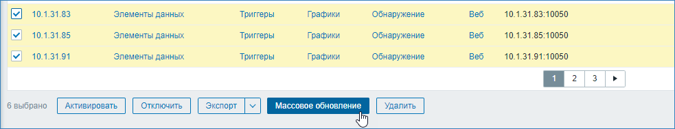 - Выберите требуемые триггеры. Нажмите на кнопку Массовое обновление (Mass update).