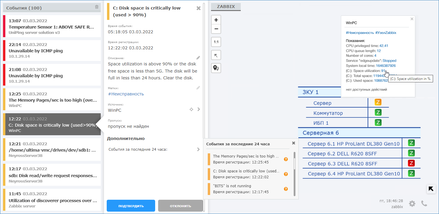 В системах безопасности важно контролировать техническое состояние серверов, источников бесперебойного питания и показания датчиков, сетевую нагрузку, отслеживать занятость и процент битых секторов жестких дисков, объём оперативной памяти, падения служб и доступность веб-интерфейсов. Оптимальный способ для решения таких задач — сервер Zabbix. Zabbix — бесплатное программное обеспечение с открытым исходным кодом; предоставляется документация на русском языке, форум техподдержки, готовые шаблоны для мониторинга множества типов оборудования и программных средств, возможно автоматическое обнаружение узлов. Многие производители оборудования предоставляют шаблоны для интеграции в Zabbix.