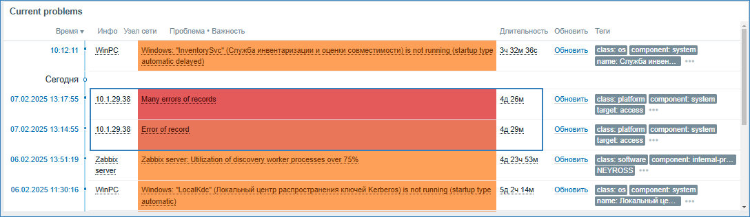 В данном решении передача данных из Платформы НЕЙРОСС в Zаbbix осуществляется посредством задания автоматизации путём отправки HTTP PUT-запроса. На сервере Платформы НЕЙРОСС достаточно настроить задание автоматизации (установка Zabbix-агента не требуется). На сервере Zabbix достаточно импортировать шаблон и назначить его соответствующему узлу. Шаблон для мониторинга Платформы НЕЙРОСС может включать широкий круг данных и событий Платформы. В качестве примера мы сформировали шаблон, который позволяет получать следующие данные: Инвентаризационные данные Платформы НЕЙРОСС: Сообщения о ошибках записи отображаются на панели мониторинга. Обработка данных событий осуществляется штатными средствами Zabbix. Вы можете добавить в данный шаблон собственные элементы данных и триггеры к ним самостоятельно или заказать разработку расширенного шаблона специалистам компании ИТРИУМ.Общие сведения