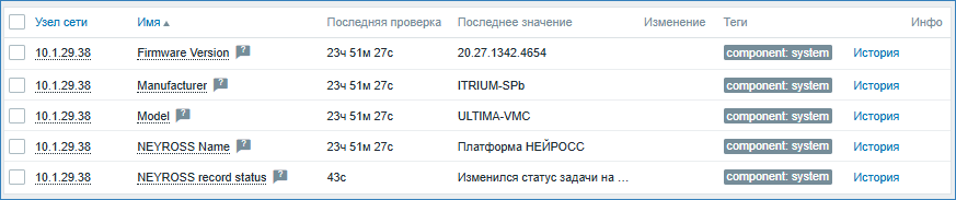 Имя элемента данных Поле инвентаря узла сети Описание Пример NEYROSS Name Псевдоним Имя узла Платформы, заданное в поле имя узла в разделе Подключение к сети. Платформа НЕЙРОСС Model Модель Модель узла. ULTIMA-VMC Firmware Version Программное обеспечение Версия программных средств Платформы НЕЙРОСС. 20.27.1342.4654 Manufacturer Поставщик Производитель программного обеспечения. ITRIUM-SPb