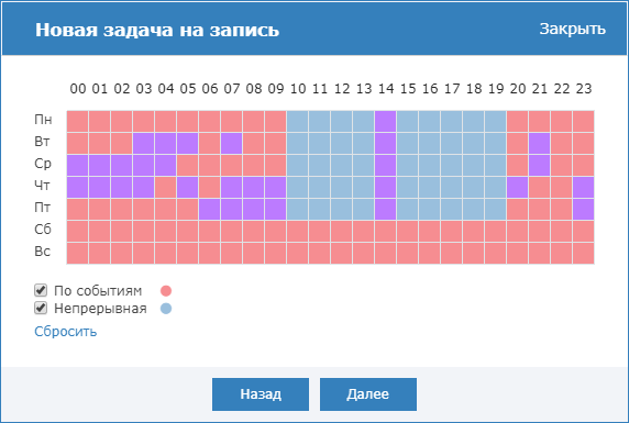 Если был задан комбинированный режим, то расписание записи задаётся независимо для каждого выбранного потока. Запись по событиям указана красным, непрерывная запись — голубым, комбинированная запись (оба потока одновременно) — фиолетовым.