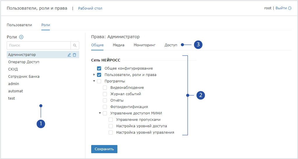 На вкладках Медиа, Мониторинг, Доступ задайте права роли на текущем узле Платформа НЕЙРОСС (с IP-адреса которого выполнен вход в интерфейс) согласно инструкции в разделе [Управление пользователями]. Вы можете настроить следующие права:
