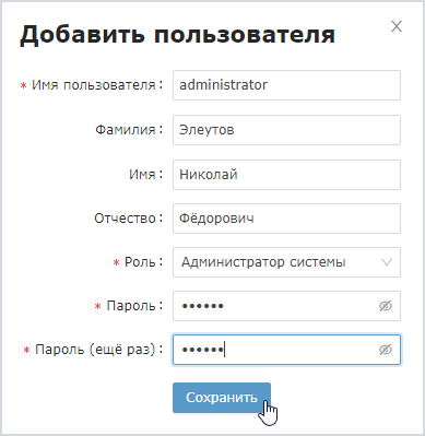 В отобразившемся окне введите ФИО пользователя, выберите из раскрывающегося списка требуемую роль, задайте пароль пользователя. Нажмите на кнопку Сохранить.