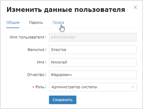 - На вкладке Общие измените ФИО и роль пользователя, если требуется. Нажмите на кнопку Сохранить;