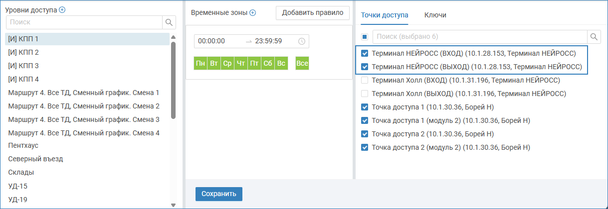 | Уровень доступа | Возможность постановки отметок о приходе на рабочее место и уходе с него определяются уровнем доступа пропуска. Терминал НЕЙРОСС имеет две виртуальные точки доступа, эмулирующие ВХОД и ВЫХОД соответственно. При необходимости постановки отметок о приходе на рабочее место и уходе с него: