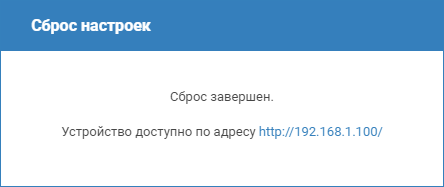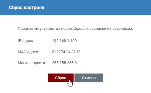 - Отобразится окно подтверждения с информацией о смене IP-адреса на заданный по умолчанию. Нажмите на кнопку Сброс.