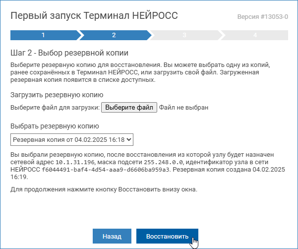 При необходимости восстановления узла из созданной ранее резервной копии данного узла, перейдите к разделу [Восстановление из резервной копии].