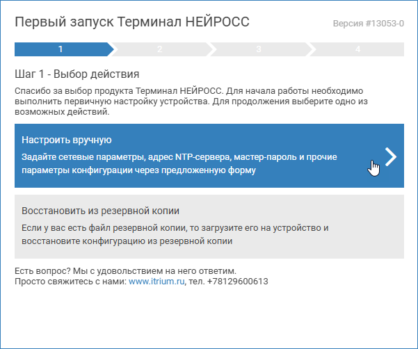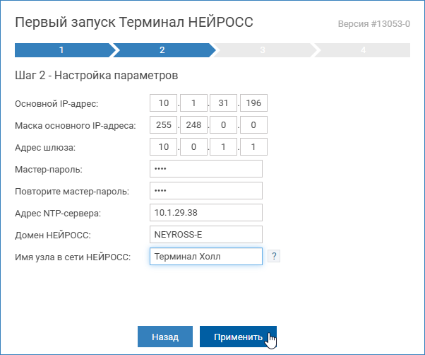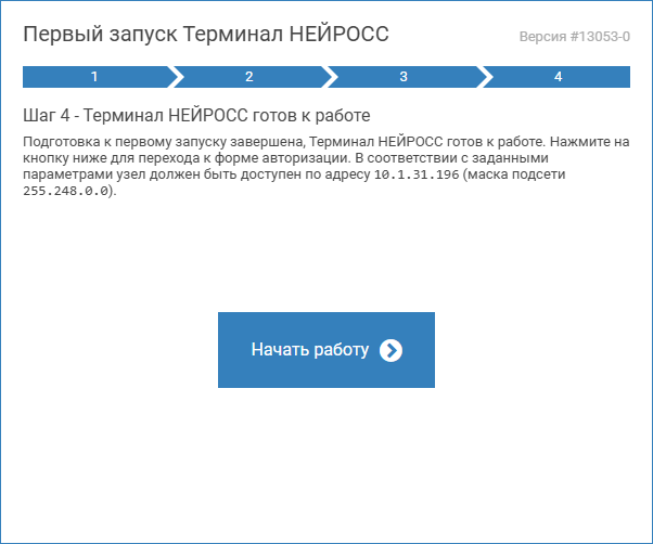 Мастер первого запуска предоставляет возможность первичной настройки Терминала НЕЙРОСС. Запуск мастера осуществляется автоматически при доступе по IP-адресу ранее не сконфигурированного узла (или узла, настройки которого были сброшены).