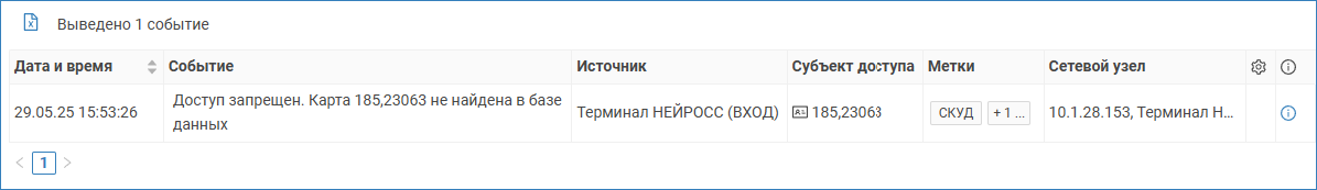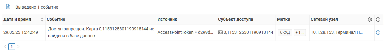 - В Журнале событий найдите событие «Доступ запрещён». В нём будет указан полученный считывателем номер карты в десятичном формате.