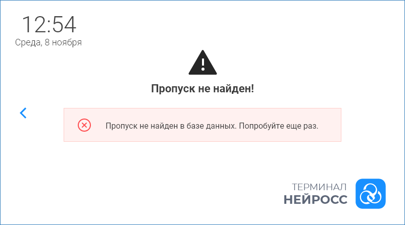 Если данные пропуска не загружены в Терминал НЕЙРОСС или предъявлена невалидная карта/пин-код отображается ошибка «Пропуск не найден».