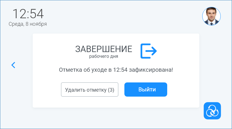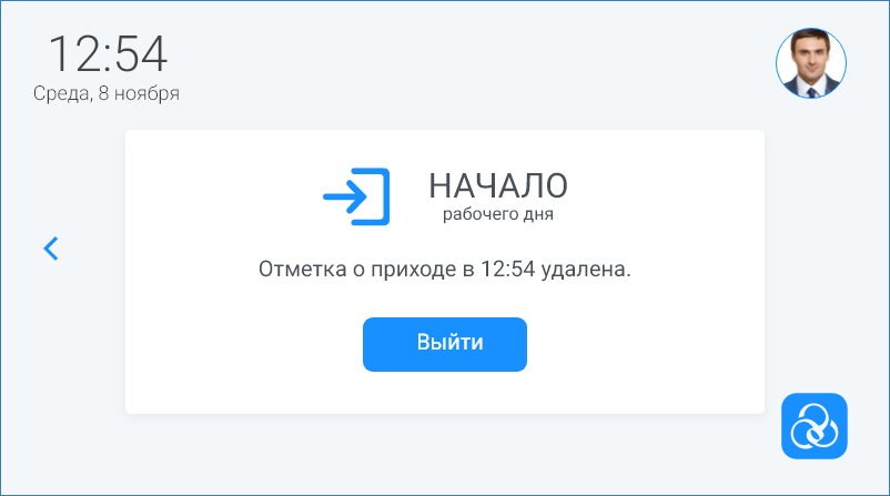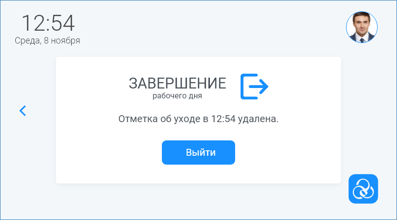 - после постановки отметки о начале или окончании рабочего дня и истечения периода времени в 5 секунд;