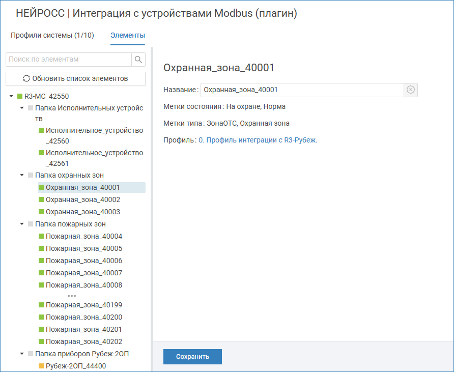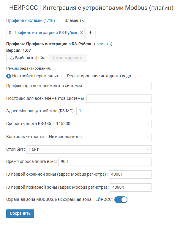Общие принципы настройки приведены в разделе [Настройка плагина Modbus-интеграции], ниже даны указания по настройке профиля для системы Rubezh R3.