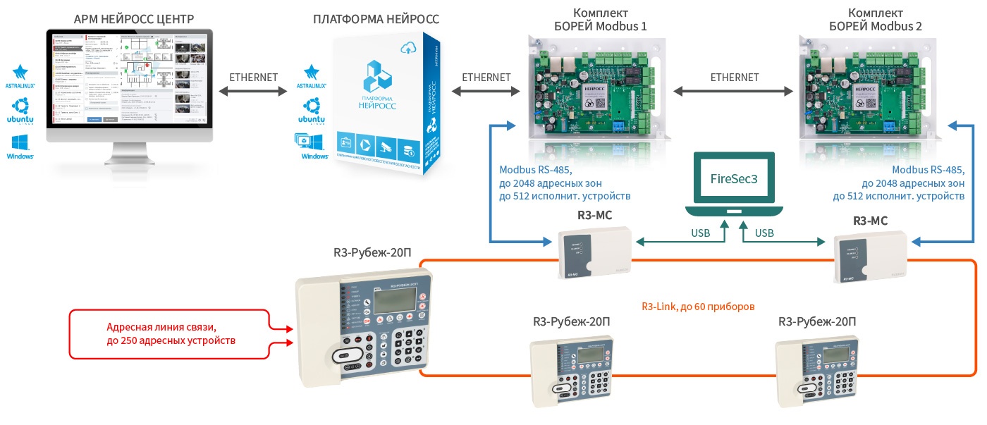 В контуре R3-link может быть несколько модулей сопряжения R3-MC. Каждый из них подключается к отдельному БОРЕЙ Modbus. Это позволяет сегментировать систему. Настройка адресных элементов и исполнительных устройств ИСБ Rubezh R3 осуществляется посредством ПО FireSec при непосредственном подключении к R3-МС по интерфейсу USB. Далее конфигурация вычитывается автоматически плагином Modbus-интеграции и передаётся в сеть НЕЙРОСС. Мониторинг состояний и управление элементами ИСБ Rubezh R3 осуществляется посредством АРМ НЕЙРОСС Центр.