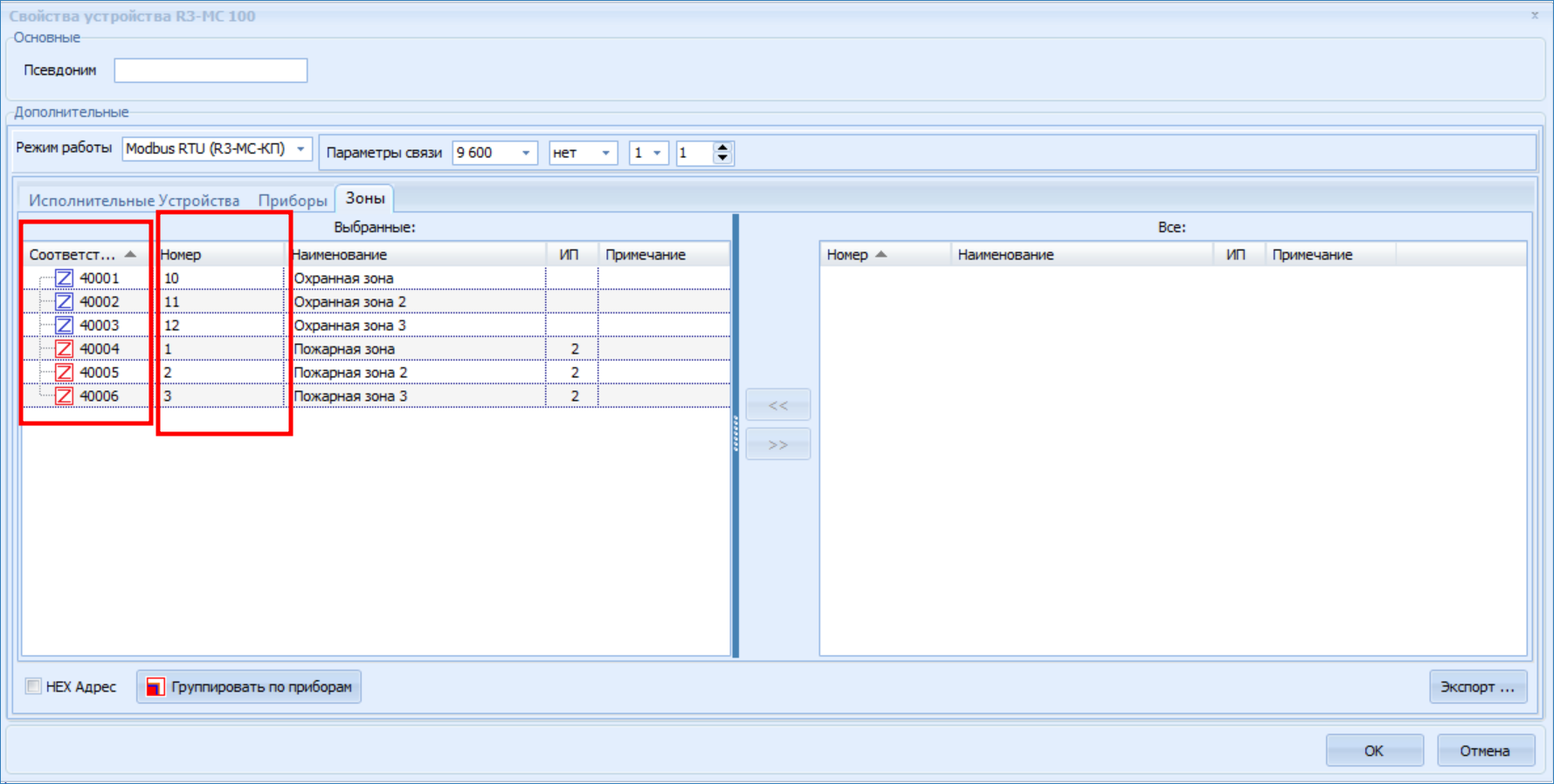 Так как интерфейс Modbus не позволяет определить тип зоны сигнализации, при формировании списка зон добавляйте их в конфигурацию R3-MC последовательно, разграничивая по типам: сначала зоны охранной сигнализации, затем зоны пожарной сигнализации или наоборот. Путём указания адресов регистров в параметрах профиля Modbus, это позволит узнать тип зоны из сети НЕЙРОСС.