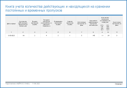 | Примечание | Отчёт строится только на текущую дату, по каждой папке пропусков индивидуально. В графе 2 указывается количество действующих пропусков на начало дня. В графе 3 указывается количество пропусков, выданных на руки за день. В графе 4 указывается количество погашенных пропусков за день. В графе 5 указывается количество возвращенных пропусков за день. В графе 6 указывается количество утерянных пропусков за день. В графе 7 указывается количество изготовленных пропусков за день. В графе 8 указывается количество действующих пропусков на конец дня, Графа 8 = Графа 2 – Графа 4 – Графа 5 – Графа 6 + Графа 7. В графе 9 указывается общее количество изготовленных пропусков на хранении на конец дня, Графа 9 = Графа 9 предыдущего дня – Графа 3 + Графа 7. В графе 10 указывается общее количество возвращенных пропусков на хранении на конец дня, Графа 10 = Графа 10 предыдущего дня + Графа 4 + Графа 5 – Графа 11. В графе 11 указывается количество уничтоженных пропусков за день. |