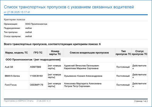 | Примечание | Данные по транспортным средствам и их водителей с группировкой по организации/подразделению. Если для транспортного средства не задана организация и подразделение, формируется группа [Нет организации] / [Нет подразделения]. Если для ТС не указаны владельцы, указывается [Нет владельцев]. |
