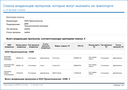 | Примечание | Данные по владельцам транспортных средств с группировкой по организациям/подразделениям. Каждая группа выводится на отдельной странице. Если для владельца не задана организация и подразделение, формируется группа [Нет организации] / [Нет подразделения]. Данные также могут быть отфильтрованы по типу и/или статусу пропуска. Если для ТС не указаны водители, в поле ФИО указывается [Владелец пропуска отсутствует]. |