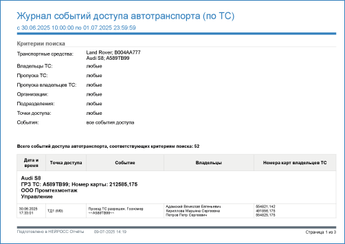 Список событий доступа транспортных средств с группировкой по транспортным средствам. Предоставляются широкие возможности фильтрации событий по транспортному средству, владельцу, пропускам, типу события с дополнительным фильтром по тексту сообщения о событии. Для вывода событий без группировки по какому-либо признаку используйте шаблон Журнал событий доступа автотранспорта (по дате).