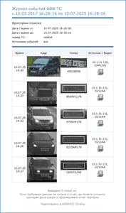 Список событий фотовидеофиксации транспортных средств. События выводятся единым массивом, без группировки по какому-либо признаку. Предоставляется возможность просмотра фотографии ТС в увеличенном режиме, а также просмотр видеоархива по событию фотовидеофиксации. Данные в отчете могут быть отфильтрованы по номеру ТС, а также по каналу ФВФ.