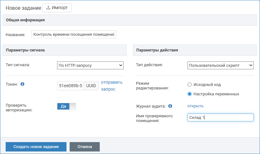 Для удобства мы подготовили готовый код задания автоматизации. Обратитесь к специалистам компании ИТРИУМ, мы вышлем подготовленный файл в формате JSON. Вам потребуется импортировать полученный файл и указать имя помещения.