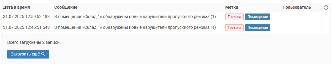 В Системный журнал записывается сообщение вида «В помещении [Имя контролируемого помещения] обнаружены нарушители пропускного режима (количество нарушителей)».
