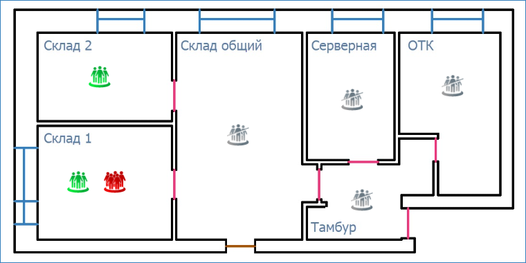 Иконка помещения Склад 1 (нарушители) становится красной. Вы можете просмотреть список нарушителей и сформировать отчёт по шаблону [Список людей в помещении].