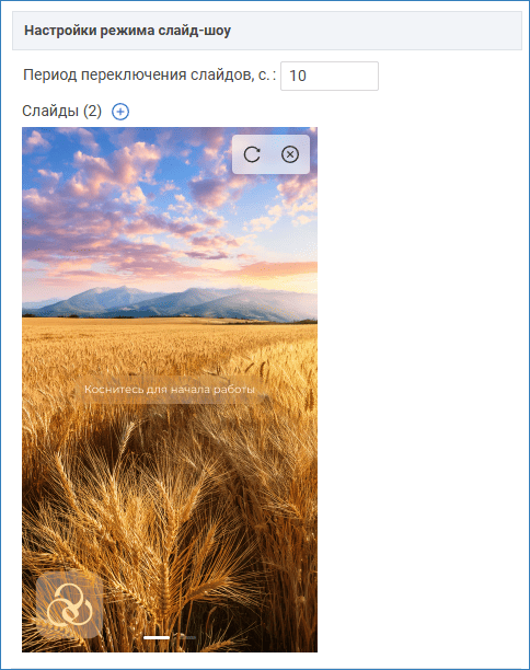 | Период переключения слайдов, сек | Натуральное число | 10 | Временной интервал в секундах, по истечении которого производится смена изображения слайд-шоу. |