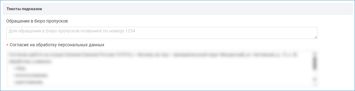 | Согласие на обработку персональных данных | Произвольный текст | - | Введите текст, который будет отображаться на экране согласия. |