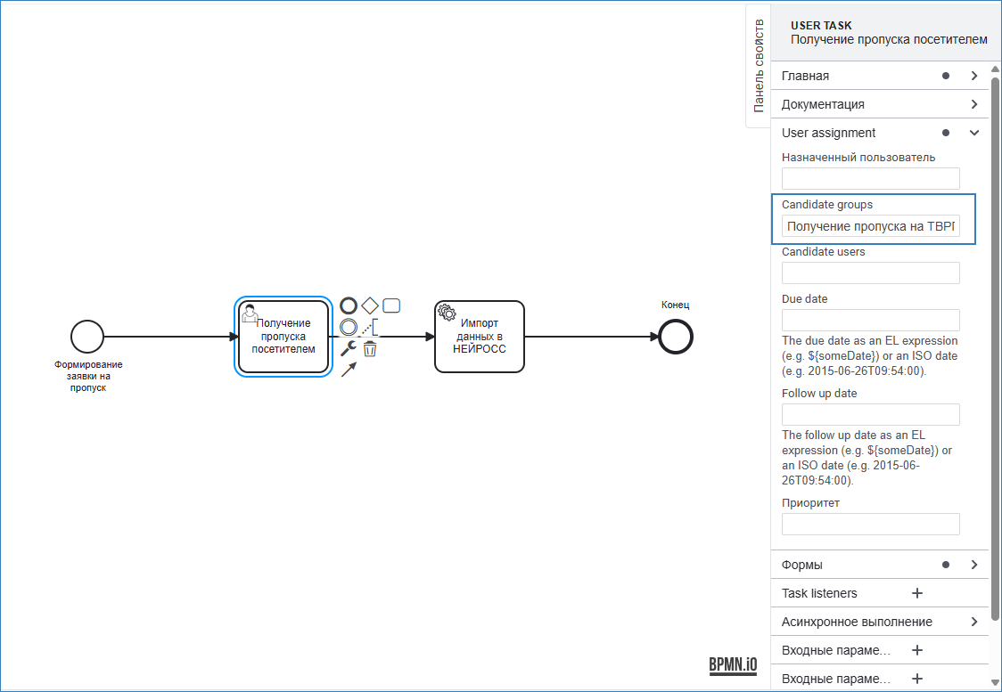 Выберите левой клавишей мыши шаг согласования Получение пропуска посетителем, откройте панель свойств и просмотрите заданную целевую группу пользователей. Эти сведения вам потребуются для назначения прав работы с заявками операторам.