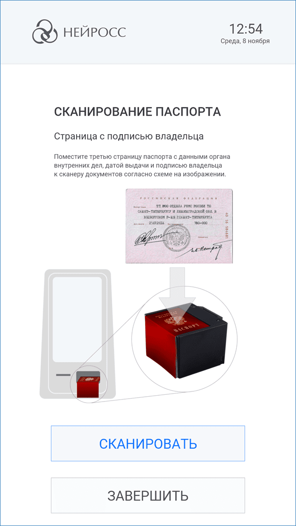 На следующем шаге поместите третью страницу паспорта с данными органа внутренних дел, датой выдачи и подписью владельца к сканеру документов согласно схеме на изображении. Нажмите на кнопку Сканировать. Не убирайте документ до завершения процедуры сканирования и вывода отсканированных данных.
