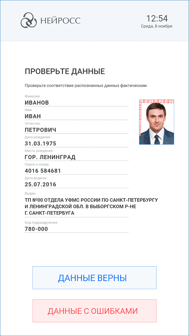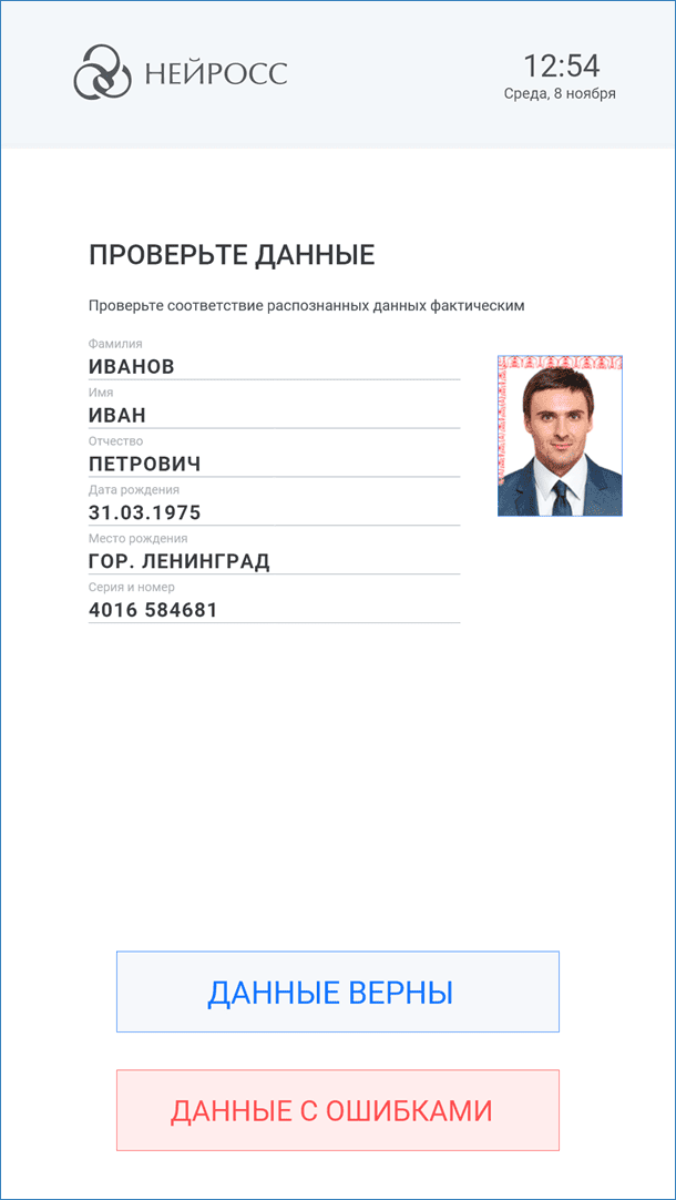 На следующем шаге проверьте отсканированные данные. Если всё верно, нажмите на кнопку Данные верны. В противном случае нажмите на кнопку Данные с ошибками и повторите процедуру сканирования.