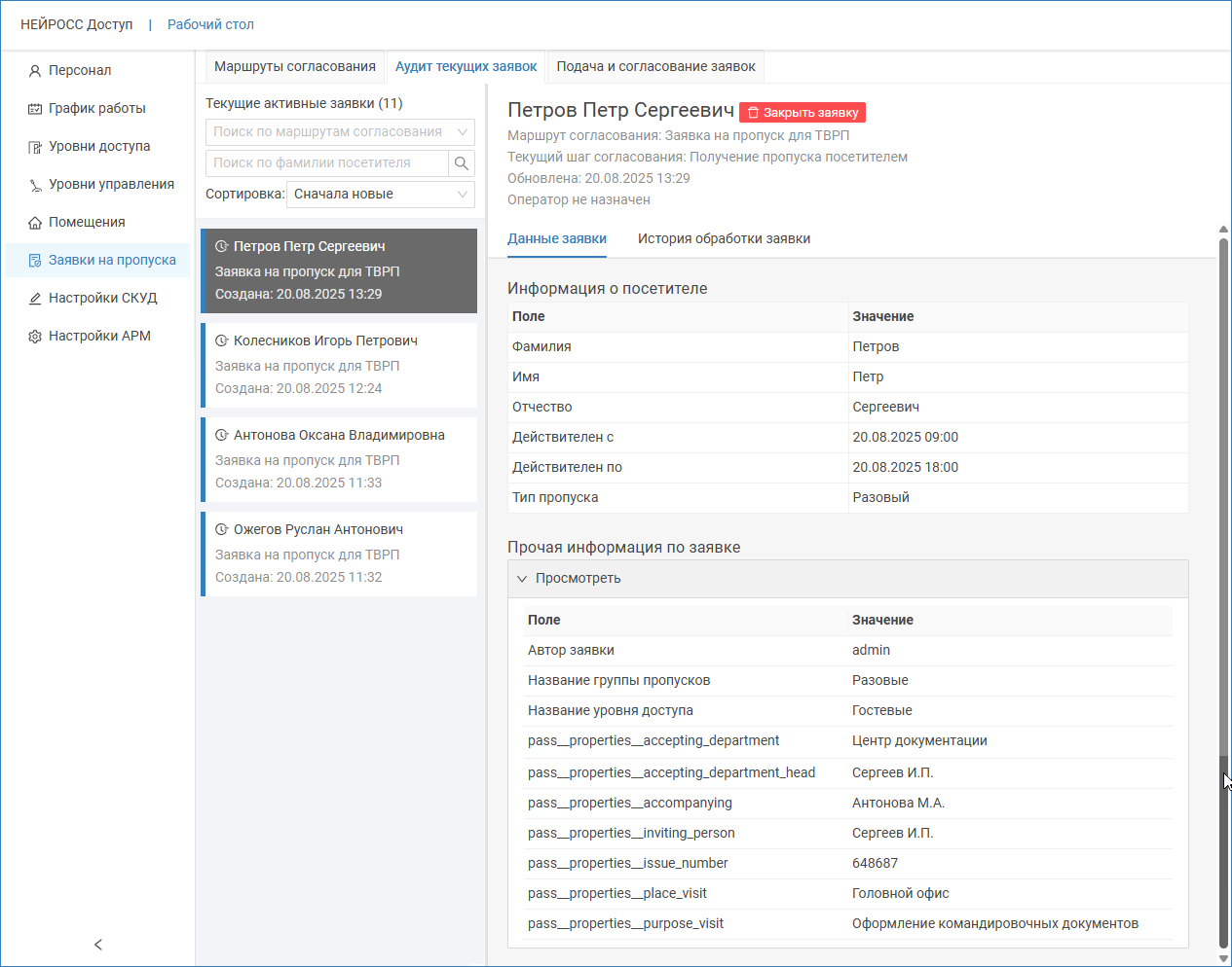 Завершение заявок осуществляется в разделе Заявки на пропуска АРМ НЕЙРОСС Доступ, вкладка Аудит текущих заявок.