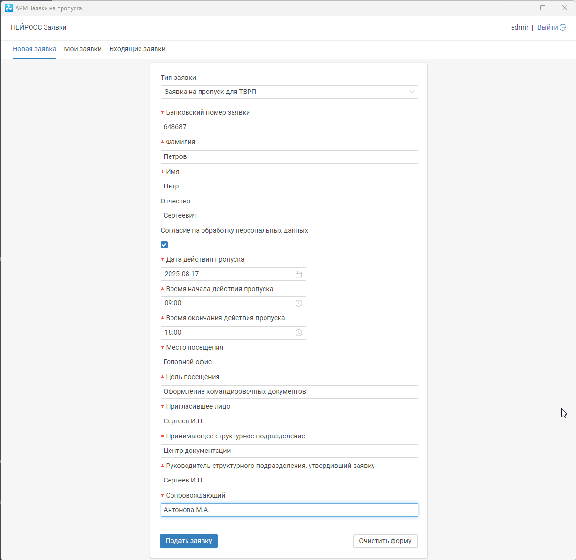 Платформа НЕЙРОСС обеспечивает автоматизированную выдачу пропусков посетителям на основе ранее поданной заявки на пропуск. Заявка оформляется через заявочную пропускную систему по маршруту согласования «Заявка на пропуск для ТВРП».