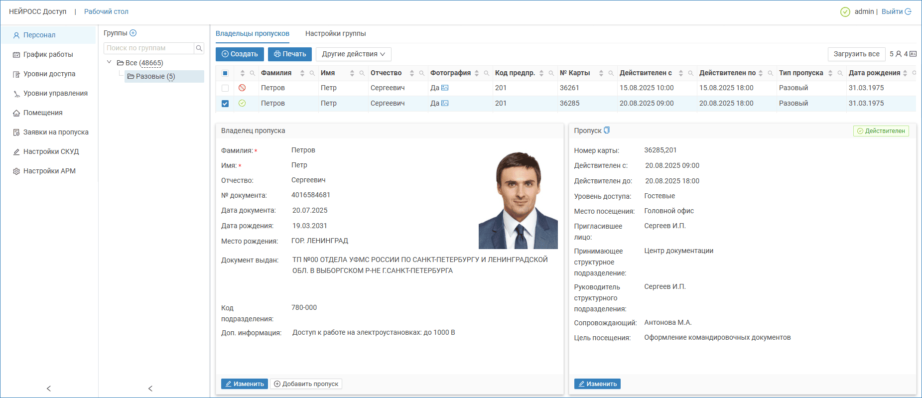Если посетитель не в первый раз посещает объект, выполняется поиск владельца пропуска и новый пропуск оформляется для уже существующего владельца. В таблице пропусков отображаются данные по всем пропускам владельца.