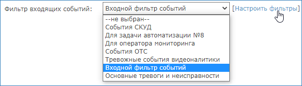 В блоке Прочее вкладки Платформа НЕЙРОСС в поле Фильтр входящих событий выберите из раскрывающегося списка созданный ранее фильтр или нажмите [Настроить фильтры] для перехода в редактор фильтров [События и фильтры].