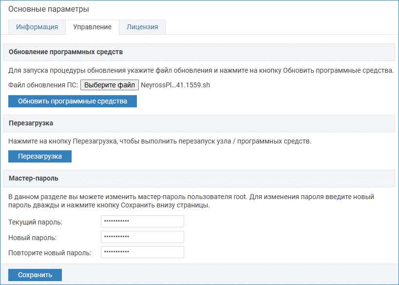 Обеспечьте доступ к файлу обновления с компьютера, на котором осуществляется доступ к веб-интерфейсу узла. На вкладке Управление в блоке Обновление программных средств в поле Файл обновления ПС укажите путь к файлу новой версии, нажмите на кнопку Обновить программные средства. Будет выполнена процедура обновления программных средств с последующей перезагрузкой. По завершении нажмите на кнопку Закрыть. ВАЖНО Процедура обновления может занимать длительное время. Не прерывайте процесс. Дождитесь информации о завершении обновления!