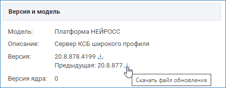 В разделе основных параметров [Версия и модель] Платформы НЕЙРОСС указаны текущая и предыдущая версия Платформы НЕЙРОСС, установленные на данном сервере. В строке с информацией о предыдущей версии нажмите на иконку Скачать файл обновления.